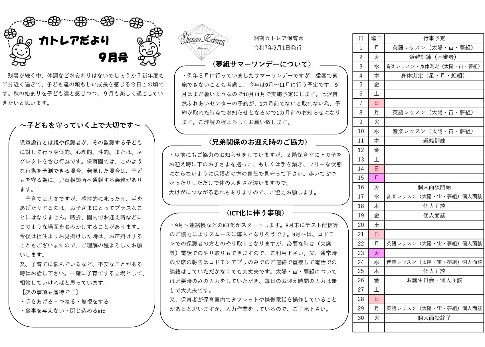 カトレアだより9月|厚木市にある認可保育園の湘南カトレア保育園です。