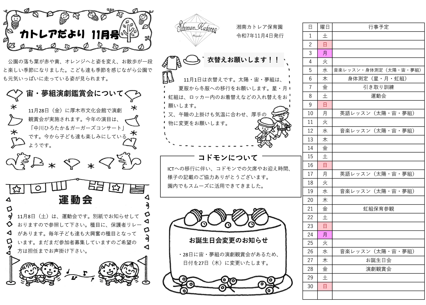 カトレアだより11月|厚木市にある認可保育園の湘南カトレア保育園です。